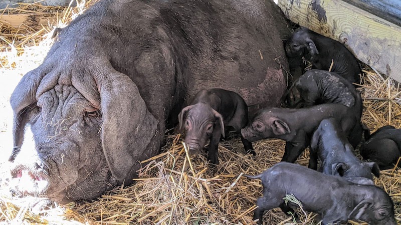 Mulan is a purebred Meishan sow. She is the source for all our piglets, including replacement gilts for LVBA.